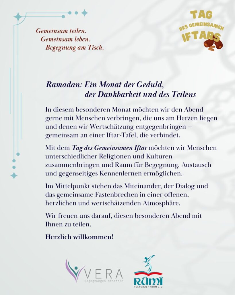 Mit dem Tag des Gemeinsamen Iftar möchten wir Menschen unterschiedlicher Religionen und Kulturen zusammenbringen und Raum für Begegnung, Austausch und gegenseitiges Kennenlernen schaffen.